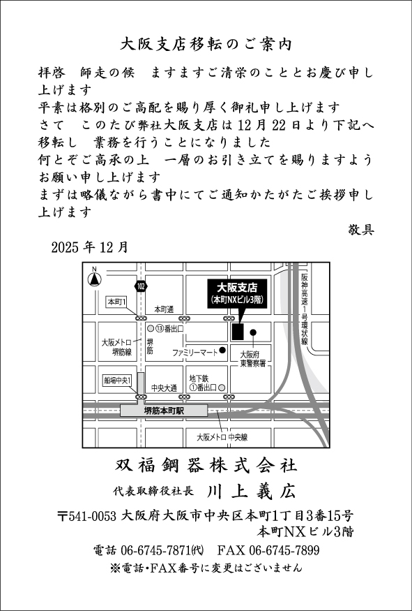 双福鋼器では2024年12月28日(土)~2025年1月5日(日)まで本社・工場、及び東京支店、大阪支店は休業とさせていただきます。 1月6日(月)より通常営業となりますので、宜しくお願い申し上げます。